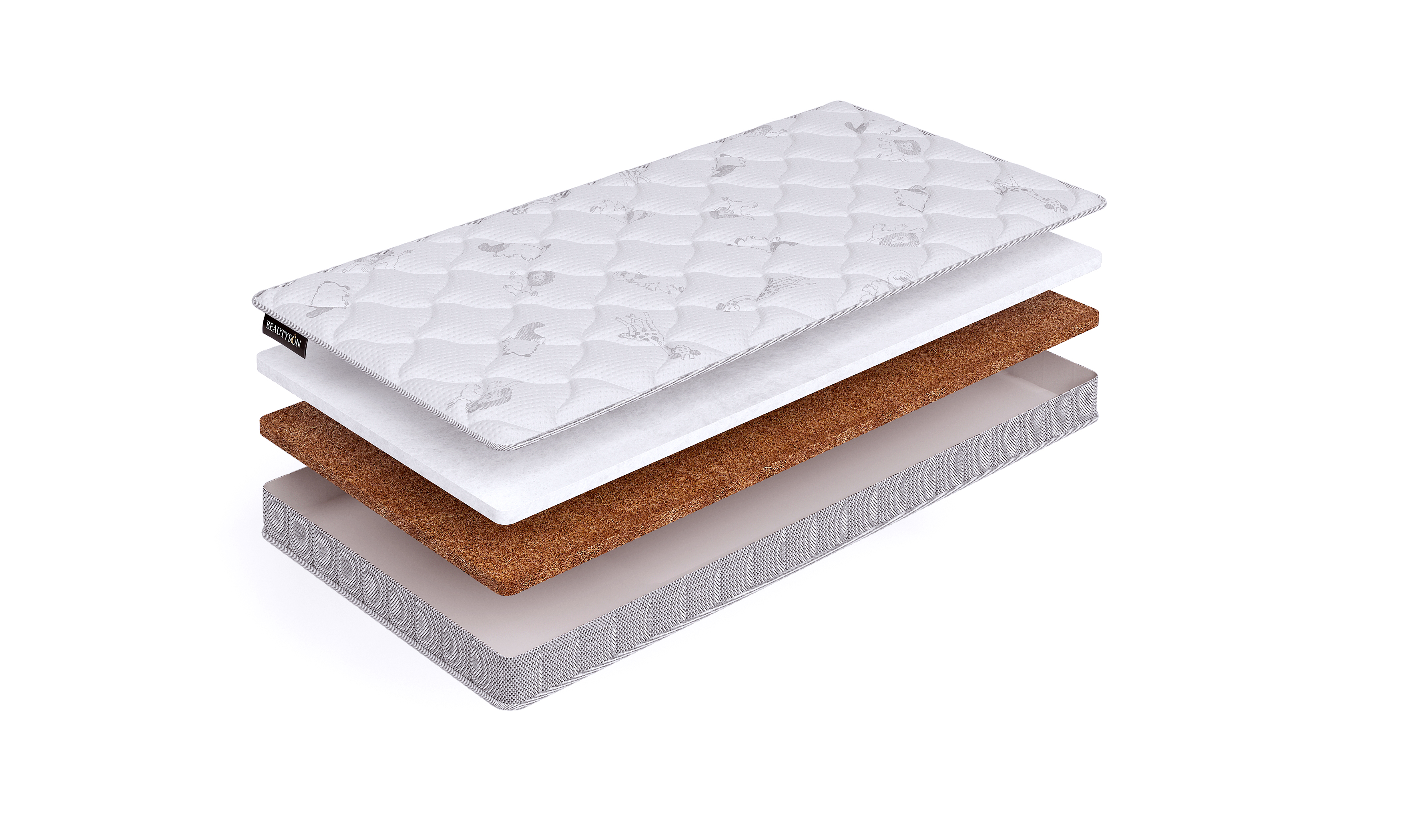 Матрас обладает разным уровнем жесткости сторон. Одна сторона выполнена из холлофайбера – легкого и упругого материала. Отличительным преимуществом холлофайбера является то, что он совершенно не впитывает влагу – это значительно облегчает просушку детского матраса в случае необходимости. Другая сторона выполнена из кокосовой койры – жесткого материала, обладающего бактерицидными свойствами. Все слои матраса отлично вентилируются, создавая оптимальный микроклимат изделия.