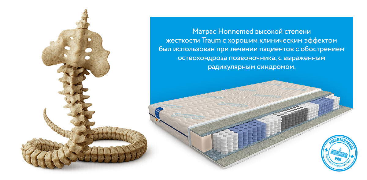 Матрас Traum, входящий в уникальную ортопедическую коллекцию Hönnemed, представляет собой идеальный выбор для людей с массой тела до 140 кг и обладает высокой жесткостью. Данная модель, как и все изделия этой линейки, рекомендована Российской Академией Наук (РАН). Она продемонстрировала положительный клинический эффект и успешно использовалась в терапии пациентов с обострениями остеохондроза позвоночника, а также при выраженных ретикулярных синдромах. Важно отметить, что матрас Traum является медицинским изделием.