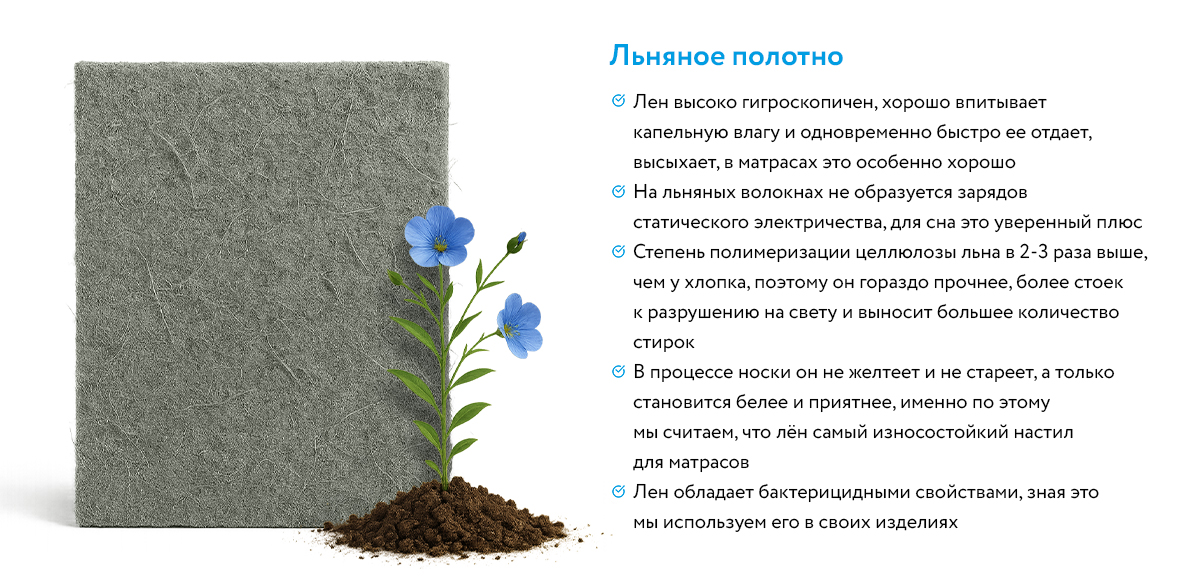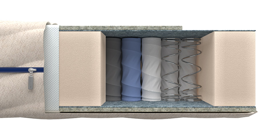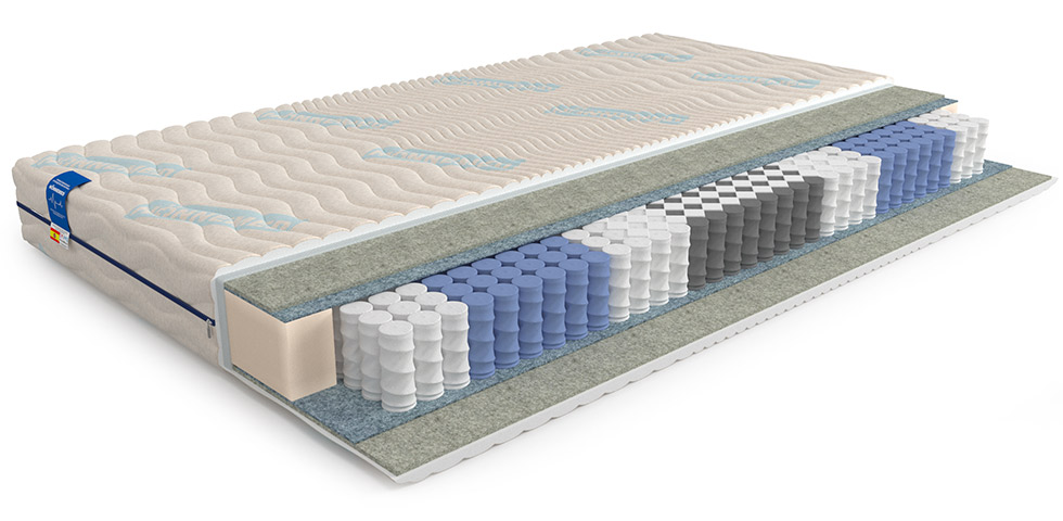 Ключевой особенностью матраса является ортопедический пружинный блок Nine Touches, который разделяется на девять зон с разной жесткостью и плотностью. Это позволяет достигнуть оптимальной поддержки для каждого участка тела. Жесткие настилы изготовлены из натурального термопрессованного льна, что гарантирует гипоаллергенность и долговечность. Съемный чехол из льняных волокон, украшенный зональным рельефным рисунком, дополнительно увеличивает ортопедический эффект, позволяя телу чувствовать максимальный комфорт во время сна.